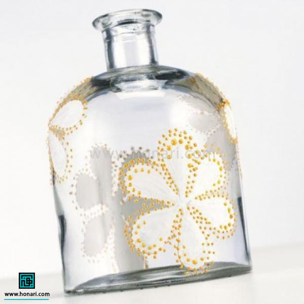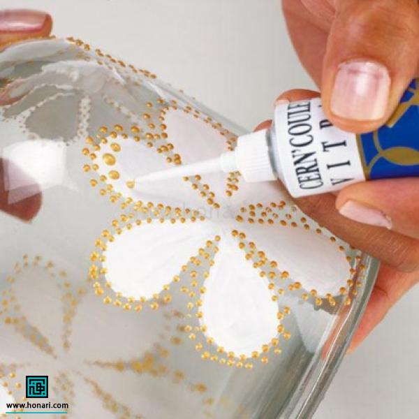 برای نقاشی روی شیشه با خمیر دورگیر، ابتدا طرحی که دوست دارید را با چسب روی ظرف شیشهای بچسبانید. سپس با استفاده از خمیر دورگیر، دور تا دور طرح را به صورت نقطه نقطه و با دقت پر کنید.