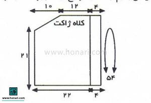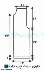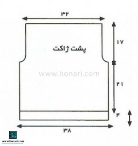پشت: با ۵۵ دانه شروع به بافتن میکنیم. وقتی قد کار به ۲۳ سانتیمتر رسید، برای قسمت حلقه آستین، از دو طرف کار به ترتیب ۱، سپس ۲ و بعد ۳ دانه سر میاندازیم. وقتی قد بافت به ۳۹ سانتیمتر رسید، همه دانههای باقیمانده را یکجا میبندیم.