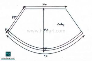 مانند قسمت جلوی کار، ۵۰ دانه را در مرکز کار به صورت جداگانه می‌بافیم. در هر رج (هم رفت و هم برگشت)، از دو طرف این ۵۰ دانه، ۲ دانه به دانه‌هایمان اضافه می‌کنیم. وقتی همه دانه‌ها به پایان رسید، از هر دو طرف کار، یک دانه کم می‌کنیم (دانه کور می‌کنیم).