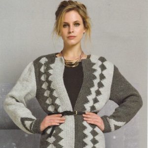 برای آستین دوم، جای رنگها را عوض کنید؛ یعنی قسمتهایی که در آستین اول با طوسی روشن بافته شد را با طوسی ببافید، و بخشهای طوسی را با نخ طوسی روشن کار کنید.