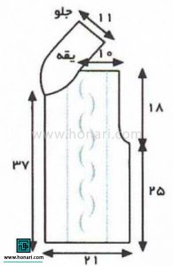 4. بعد از بافتن ۲۳ دانه جلو، ۱ دانه زیر و ۵ دانه رکن، در هر رج رفت بعدی، از کنارههای هر دو قسمت جلو یک دانه و از هر دو طرف قسمت پشت نیز یک دانه اضافه کنید. سپس ۵ رج بافت رکن کار کنید.