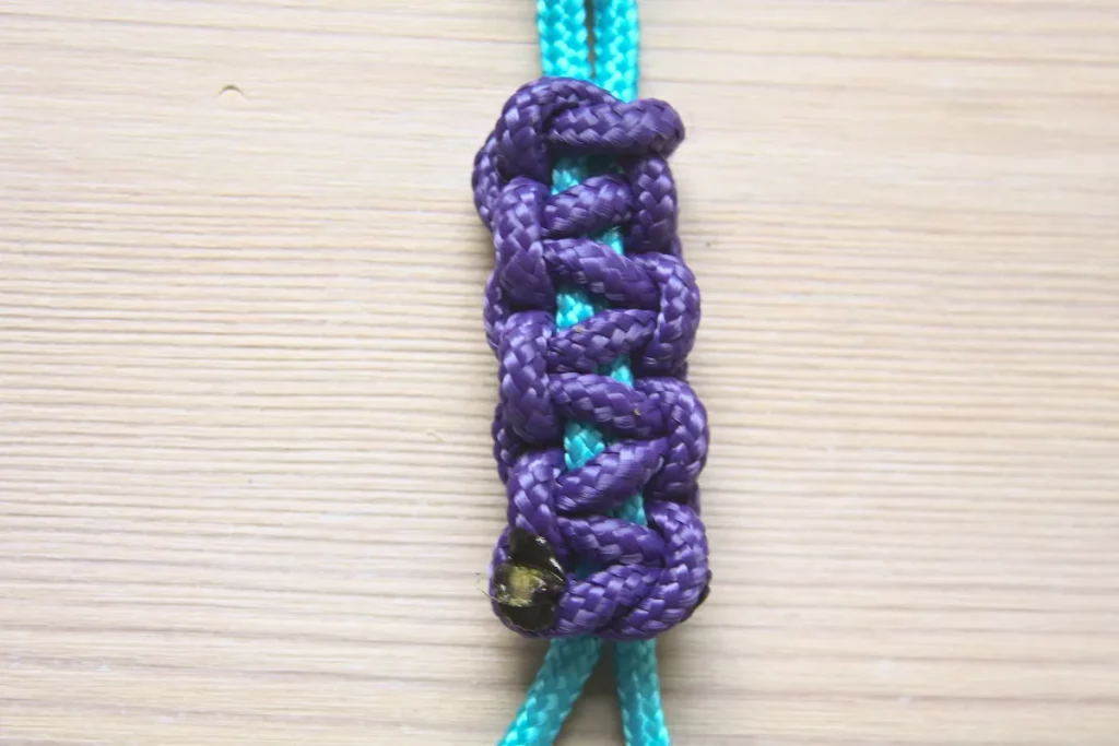 نخ را قیچی کنید و سر آن را با شعله فندک کمی ذوب کنید یا با چسب محکم کنید. هنگام انجام این کار دقت داشته باشید که به نخ‌های اصلی دستبند آسیبی نرسد.
