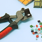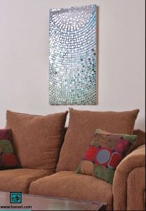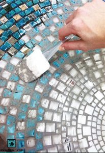 شروع میکنیم به چسباندن تکههای ریز آینه در داخل دایره کوچک. برای این کار از چسب چوب استفاده میکنیم تا هم آینه و هم کاشی به خوبی به سطح بچسبند.