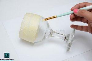 حالا با کمک یک قلمو، چسب را روی سطح کار میزنیم. مواظب باشید که چسب زیادی استفاده نکنید و سعی کنید همهی قسمتها به یک اندازه چسب بخورند.
