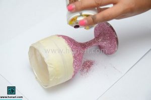 حالا نوبت به تزیین کار میرسد. روی قسمتهایی که چسب زدهاید، اکلیل بریزید. برای این کار، بهتر است اکلیل را داخل یک نمکدان بریزید و سپس آن را روی سطح کار بپاشید. با این روش، اکلیل بهطور یکنواخت و برابر روی همه قسمتهایی که چسب دارند، مینشیند و نتیجه کار تمیزتر و زیباتر میشود.