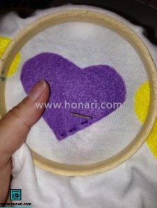 بعد از اینکه طرحهای نمدی را اتو کردید، آنها را مطابق الگوی مورد نظرتان روی لباس قرار دهید. سپس با استفاده از سوزنهای تهگرد، هر قطعه را در جای خود محکم کنید.