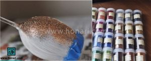 حالا با یک اکلیل که رنگش فرق دارد، مثل مرحله قبل، روی جاهایی که چسب زدیم، اکلیل میپاشیم.