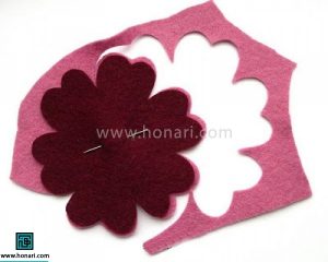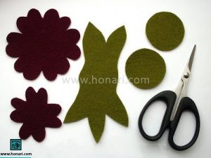 در اولین مرحله از آموزش نمددوزی، باید از الگوی آماده استفاده کنید (برای گرفتن الگو، روی گزینهٔ دریافت فایل الگو کلیک کنید). سپس هر بخش از طرح گل را روی نمد بکشید و با قیچی جدا کنید.