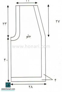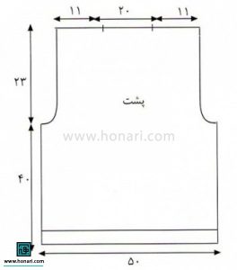 بخش پشت: ابتدا ۸۴ دانه سر میاندازیم. سپس ۲ رج به صورت بافت رو و ۱ رج به صورت بافت زیر میبافیم تا ارتفاع بافت به ۴ سانتیمتر برسد. بعد از آن، کار را با بافت ساده ادامه میدهیم. وقتی ارتفاع بافت به ۴۰ سانتیمتر رسید، از هر دو طرف کار ۸ دانه اضافه میکنیم و مانند حاشیهی بخش جلو ادامه میدهیم. زمانی که قد کار به ۶۳ سانتیمتر برسد، همهی دانهها را یکبهیک میبندیم.
