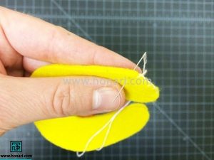 در مرحله سوم، پس از برش دادن تکههای نمدی، لبههای آن را با کمک کوک دندانهموشی به آرامی و با دقت میدوزیم تا کاملاً صاف و مرتب شود.