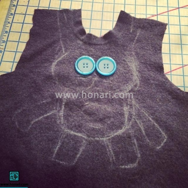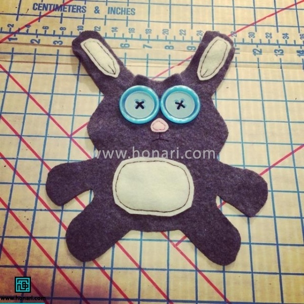 قطعه‌های نمدی مربوط به گوش‌ها، شکم و بینی خرگوش را در جای مناسب خود می‌گذاریم و با دوختن دور آن‌ها، کاملاً به بدن خرگوش وصل می‌کنیم. سپس چشم‌های دکمه‌ای را با کمک نخ و سوزن در جای خود محکم می‌دوزیم.