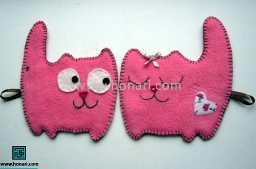 برای تزئین گربههای نمدیتان میتوانید از پاپیون و پارچههای طرحدار و گلدار استفاده کنید. همچنین با یک نوار روبان میتوانید عروسک نمدی خود را به یک آویز زیبا تبدیل کنید. یادتان باشد تمام این تزئینات را باید قبل از دوختن لبههای گربه به آن اضافه کنید.