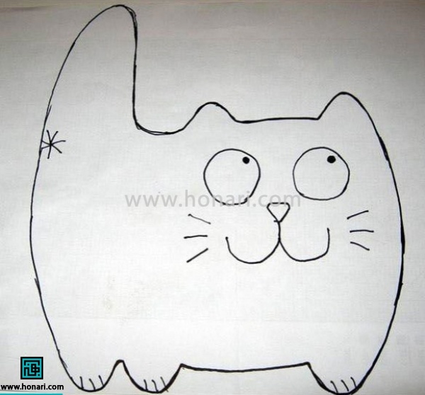 الگوی عروسک گربه را پرینت بگیرید و سپس با استفاده از مداد صابونی، شکل آن را روی پارچهی نمدی خود کپی کنید.