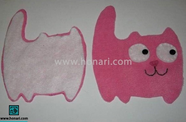 در مرحله بعد، نقشه گربه را روی نمد قرار داده و با دقت ببرید. سپس، قطعات مربوط به چشمها و بینی را با استفاده از چسب حرارتی در جای مناسب خود بچسبانید. برای قسمت دهان گربه، از دوخت کمک بگیرید.