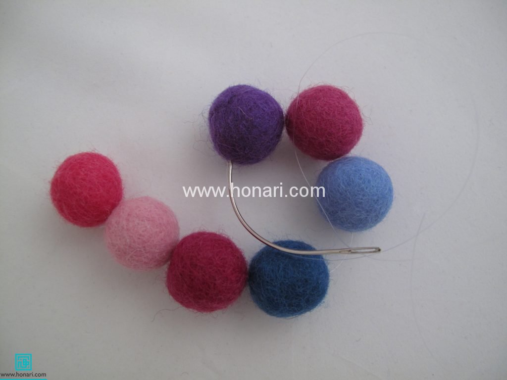 هفت توپ نمدی را به نخ وارد کنید و آن‌ها را به آرامی به انتهای نخ منتقل کنید تا یک زنجیره از توپ‌ها تشکیل شود. هر توپ را جداگانه به نخ بکشید. اگر دوست دارید از رنگ‌های مختلف استفاده کنید، می‌توانید به صورت تصادفی رنگ‌ها را انتخاب کنید یا از یک الگوی خاص پیروی کنید. من خودم توپ‌های نمدی را در کیسه‌های جداگانه بر اساس رنگ قرار می‌دهم و سپس آن‌ها را با ترتیب مشخصی برمی‌دارم.