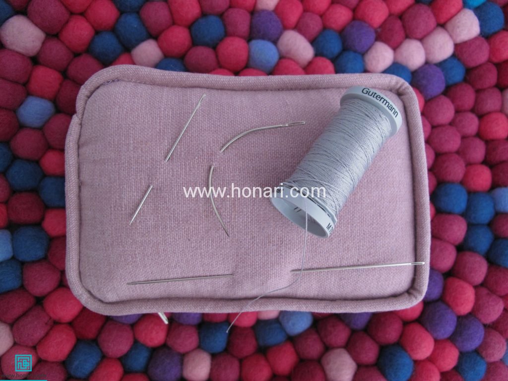 سوزن را نخ کنید و یک گره محکم در انتهای آن بزنید. نخ اضافی را بعد از گره بزنید تا تمیز و مرتب شود.