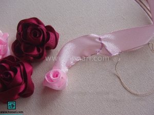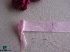 وقتی به انتهای روبان رسیدید، نخ را آرام بکشید تا روبان به صورت زیبا و منظم چین بخورد. سپس نخ را گره بزنید تا چینها ثابت بمانند. در پایان، روبان را به آرامی دور خودش بپیچید تا فرم دلخواه ایجاد شود.