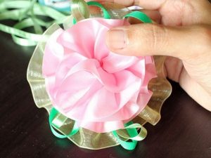 روبان ساتن را مانند مرحله قبل به صورت چین دار جمع کنید، فقط طول آن باید کوتاهتر باشد. سپس با چسب این دو روبان را به هم بچسبانید.