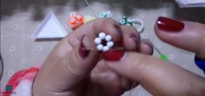 مرحله اول: ابتدا مقداری نخ نامرئی جدا کنید، سپس ۶ دانه منجوق سایز دو را بردارید و از داخل نخ رد کنید. سر دیگر نخ را از آخرین منجوقی که اضافه کردید، دوباره عبور دهید و منجوق‌ها را به سمت مرکز نخ بکشید. در این حالت، شکلی شبیه یک گل شش‌پر خواهید داشت.