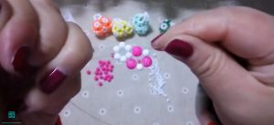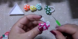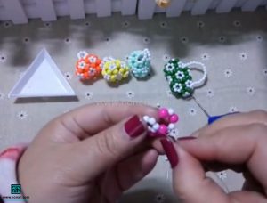 در مرحله پنجم، دوباره سه مهره برمی‌داریم. این بار اندازه همه مهره‌ها دو میلی‌متر است. سپس نخ سمت چپ را از داخل آخرین مهره عبور داده و همه مهره‌ها را به سمت مهره‌های دیگر میکشیم.