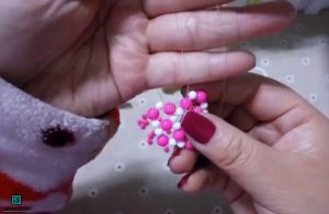 در مرحله سوم، کار با نخ سمت راست ادامه می‌یابد. ابتدا یک منجوق دو میلی‌متری و سپس یک منجوق چهار میلی‌متری به نخ اضافه می‌کنیم. این کار را آنقدر ادامه می‌دهیم تا در مجموع چهار منجوق با رنگ‌ها و اندازه‌های مختلف و با فاصله‌ی مناسب از هم، روی نخ قرار گیرند. سپس، نخ سمت چپ را از داخل آخرین منجوق عبور داده و تمام منجوق‌ها را به آرامی به سمت پایین می‌کشیم تا در جای خود محکم شوند.
