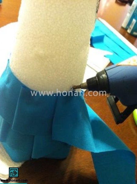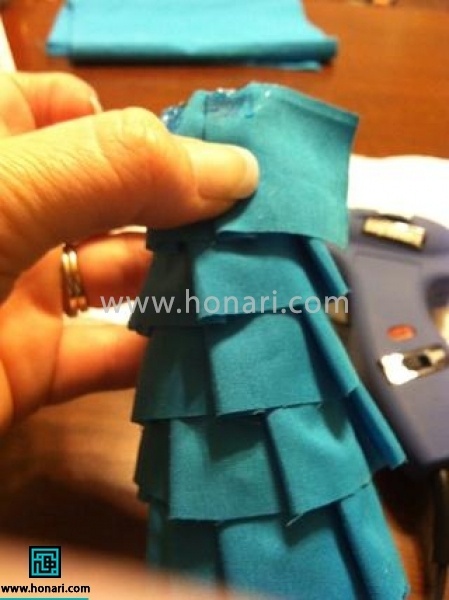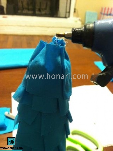 نوارهای نمدی چین خورده را با کمک چسب حرارتی روی کار بچسبانید. اندازه این چین‌ها هم به سلیقه شما بستگی دارد و هم به اندازه درخت کاجی که می‌سازید. تا جایی که ممکن است از چسب کمتری استفاده کنید تا نتیجه کار تمیزتر و زیباتر شود. این مرحله را آنقدر ادامه دهید تا تمام سطح استوانه از پایین تا بالا با این نوارها پوشانده شود. هنگام چسباندن ردیف‌های جدید، دقت کنید که لایه‌ها مقداری روی هم بیفتند. این همپوشانی باید به اندازه‌ای باشد که چین‌های ردیف قبلی همچنان دیده شوند. هر چه به قسمت بالایی درخت نزدیک‌تر می‌شوید، مقدار همپوشانی بین لایه‌ها را بیشتر در نظر بگیرید.