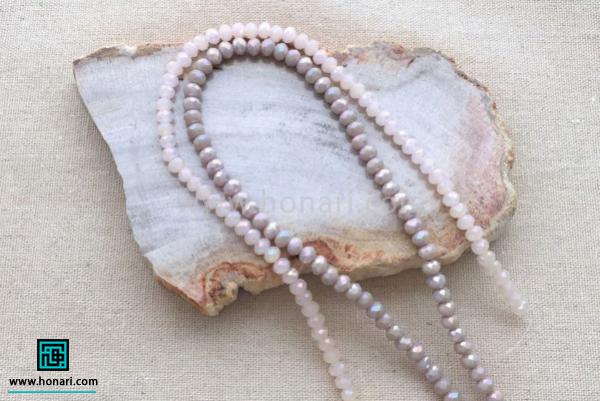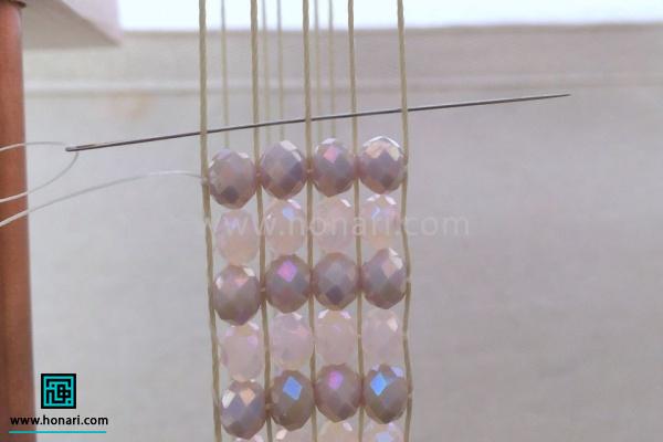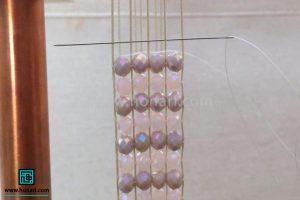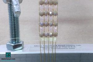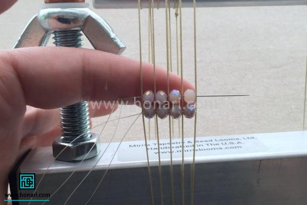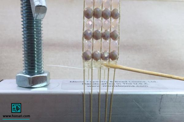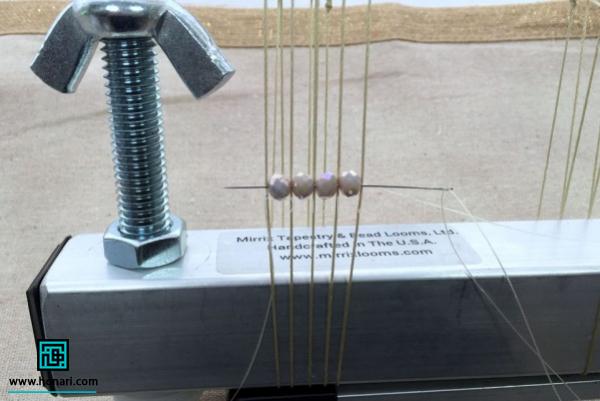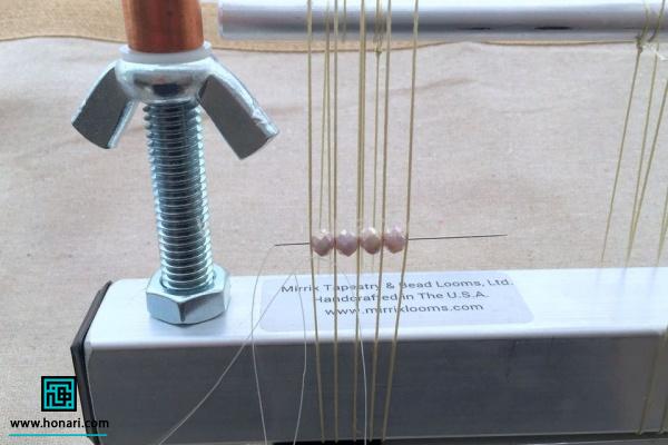 سنگها را به نخ میکشیم و آنها را دقیقاً زیر نخهایی که به دستگاه وصل شده قرار میدهیم، طوری که هر سنگ درست میان دو نخ قرار گیرد.