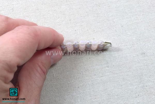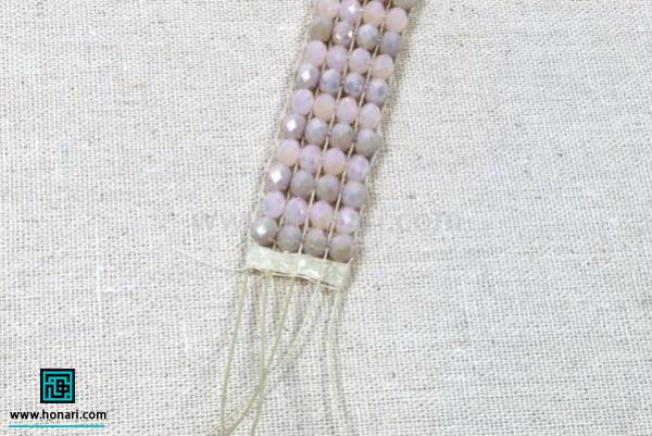 به همین روش ادامه میدهیم تا اندازه مناسبی برای وصل کردن سر دستبند به قسمتی که بافتهایم، به دست آوریم.