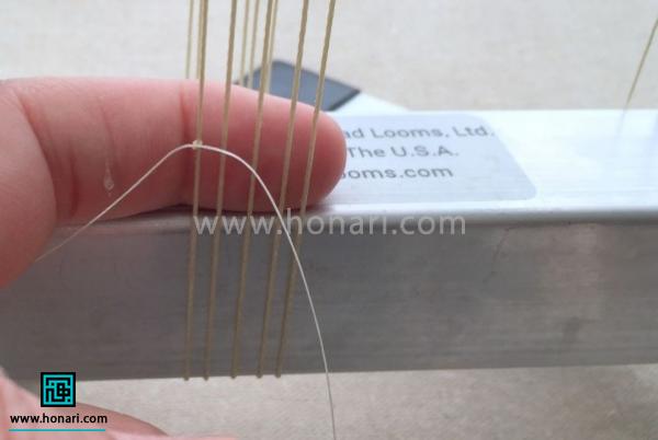 سوزن را از زیر کارگاه عبور داده و دوباره از میان مهرهها رد میکنیم.