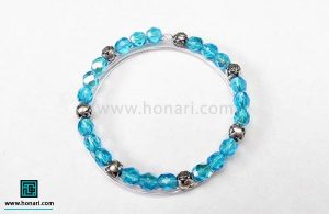 در مرحله دوم، ابتدا اندازه دور مچ دست خود را بگیرید. سپس به تعداد همین اندازه، مهره‌های آبی رنگ ۶ میلی‌متری را از داخل یک سیم مفتولی عبور دهید. برای اینکه کارتان زیباتر شود، بعد از هر سه مهره کریستالی آبی، یک مهره تزئینی کوچک به عنوان فاصله‌انداز بین مهره‌ها قرار دهید.