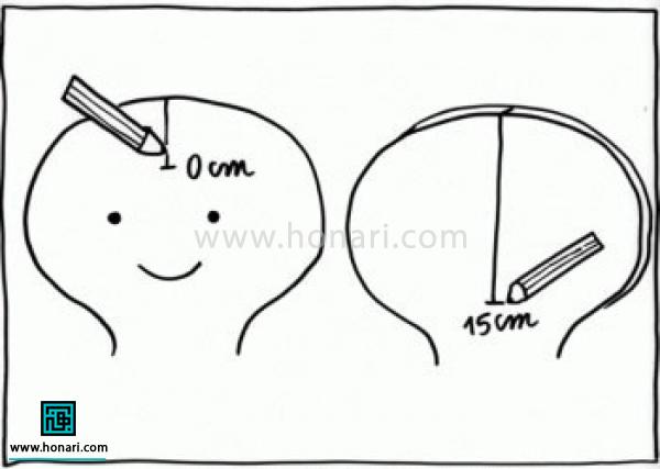 برای بافتن موهای عروسک با کاموا، اول باید اندازه دور سر عروسک را در قسمت جلو و پشت سر به دقت اندازه بگیریم، درست مثل شکلی که نشان داده شده.