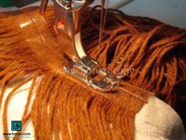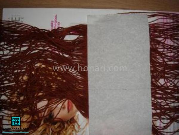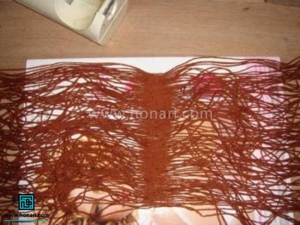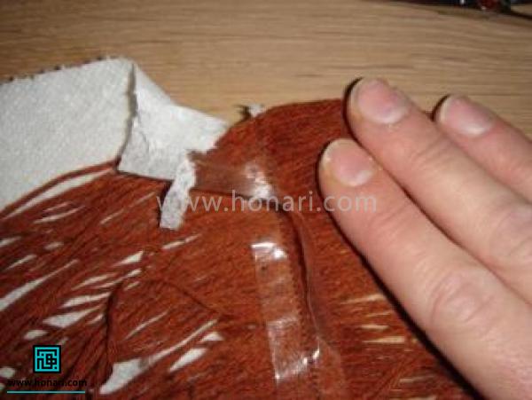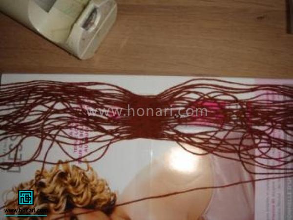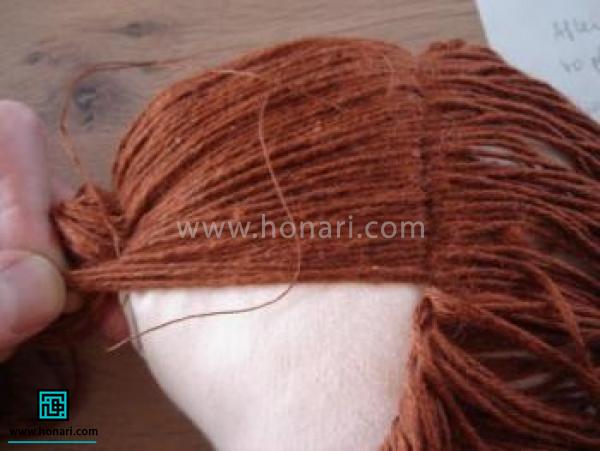 به این شکل، از ابتدای پیشانی تا انتهای پشت گردن، کاموا را روی چسب قرار می‌دهیم و محکم می‌کنیم.