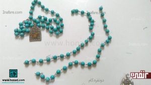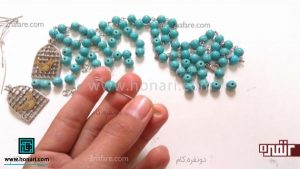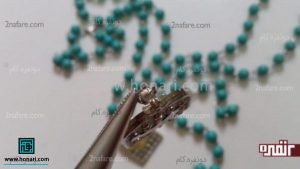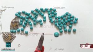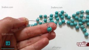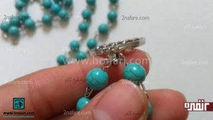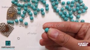 در مرحلهٔ بعد، نوک میخ قلاب را از داخل یکی از مهرههای فیروزهای عبور میدهیم.