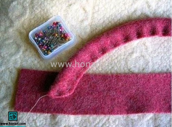 برای درست کردن گل رز، به یک نوار مستطیل شکل از نمد نیاز دارید. این نوار را از سمت عرض تا بزنید و با کمک کوک ساده، لبه آن را بدوزید. سپس لبه یکی از لبههای نوار را مانند شکلی که میبینید، برش بزنید.