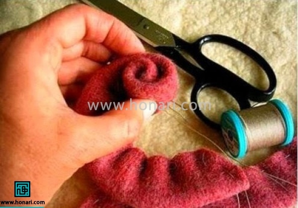 نوار نمدی را که کوک زدهاید، از یک سمت به آرامی بکشید تا کمی جمع شود و چینهای کوچکی روی آن ایجاد شود. سپس، نوار را به شکل رول و لولهای بپیچید. بعد از هر بار پیچیدن، با چند کوک ساده، انتهای نوار را محکم کنید تا از باز شدن آن جلوگیری شود. پس از آخرین دور پیچیدن، برای اطمینان بیشتر، باقیماندهٔ نوار را با چسب حرارتی ثابت و محکم کنید.