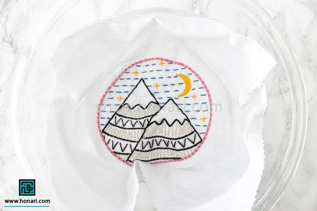 کاسه را با آب سرد پر کنید. سپس پارچه گلدوزی شده را داخل کاسه بگذارید و آن را آرام در آب بچرخانید تا اثر خطوط و نشانه‌ها از بین برود. اگر لازم بود، مقدار بسیار کمی صابون به آب اضافه کنید؛ به اندازه‌ای که آب فقط کمی کف کند. بعد از اضافه کردن صابون، دوباره پارچه را در کاسه بچرخانید.