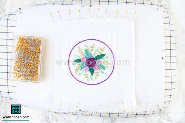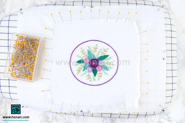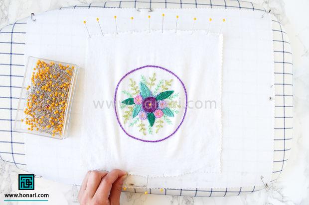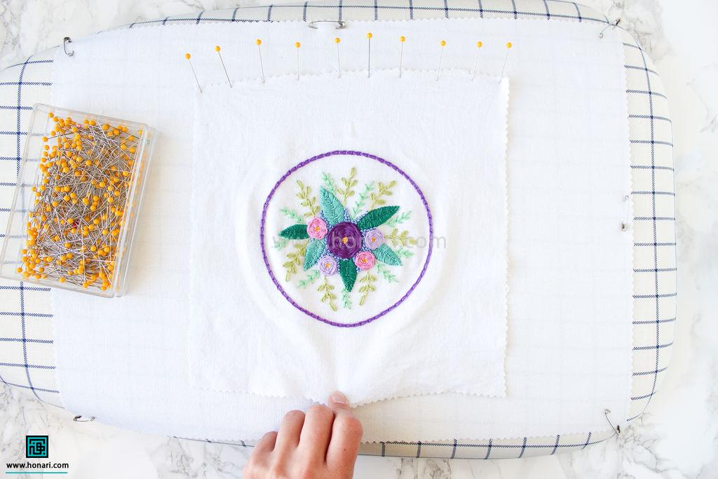 قطعه گلدوزی شده را با استفاده از سنجاق روی پارچه ای که روی میز اتو پهن شده، ثابت کنید و محکم ببندید.
