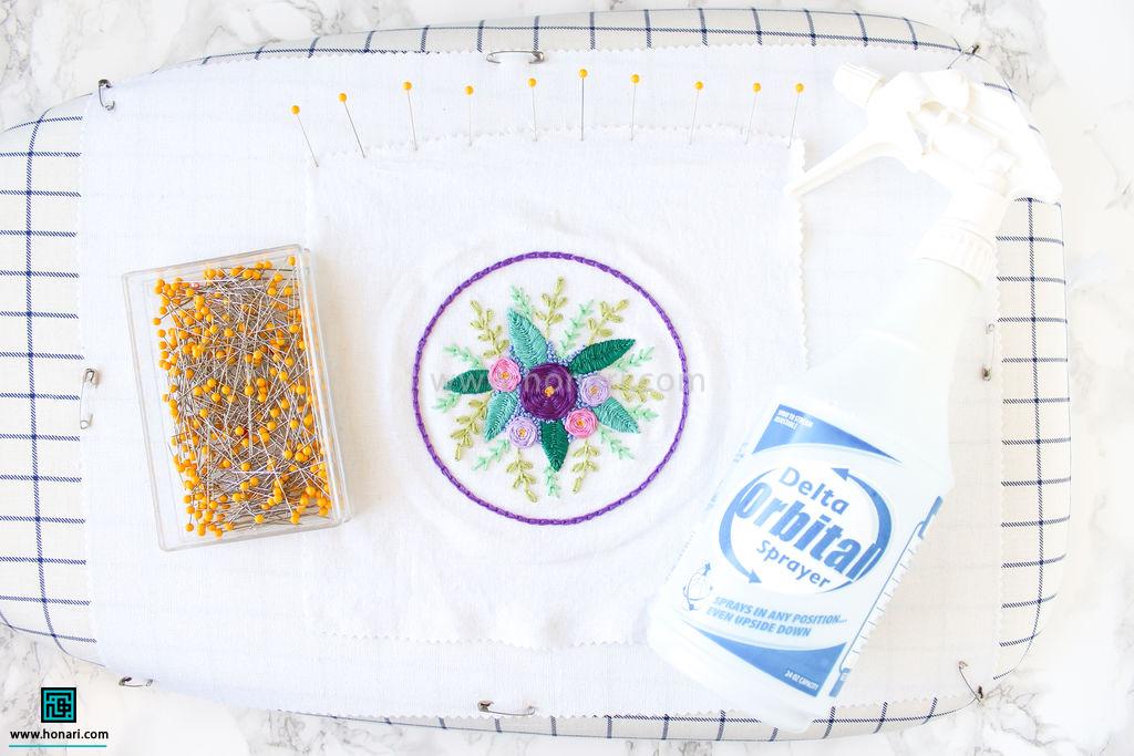 اگر کار گلدوزی خشک است، کمی با اسپری آب آن را نمدار کنید. بهتر است فقط کمی رطوبت داشته باشد و کاملاً خیس نشود. چون اگر خیلی مرطوب باشد، ممکن است سنجاق‌ها در حین کار زنگ بزنند.