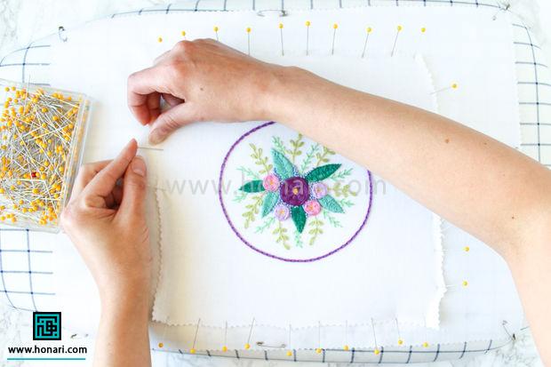 کار را از وسط شروع کنید و به تدریج به سمت لبه‌ها بروید. سنجاق‌ها را همگی روی لبه‌های گلدوزی بزنید. من معمولاً تقریباً هر دو سانت‌یمتر یک سنجاق می‌زنم، اما اگر طرح گلدوزی جزئیات بیشتری دارد، می‌توانید سنجاق‌ها را با فاصله کم‌تری از هم قرار دهید.