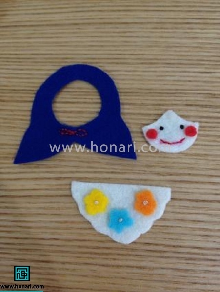 قطعههای مرتبشدهٔ قسمت جلوی عروسک نمدی را میتوانید با دوختن یا با کمک چسب حرارتی به هم متصل کنید.
