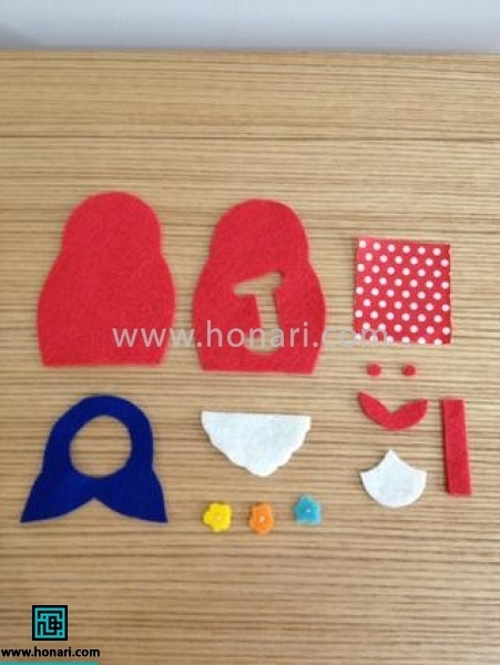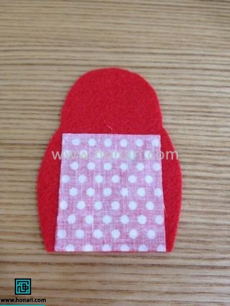 قطعههای مرتبشدهٔ قسمت جلوی عروسک نمدی را میتوانید با دوختن یا با کمک چسب حرارتی به هم متصل کنید.