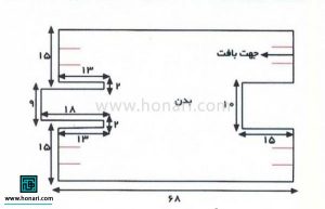 وقتی قد بافتهشده به ۵۵ سانتیمتر رسید، از این نقطه به بعد، از هر دو طرف ۴۵ دانه را جداگانه به اندازه ۱۳ سانتیمتر میبافیم و سپس از کار خارج میکنیم.