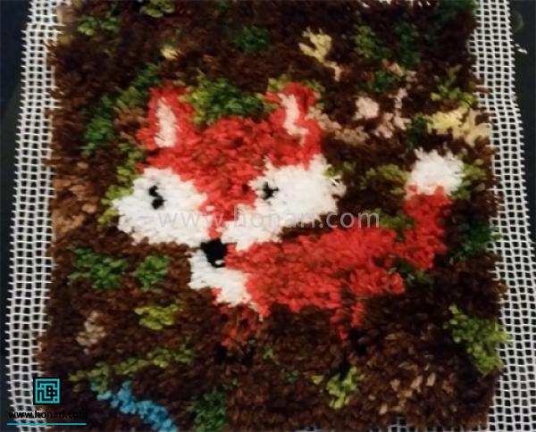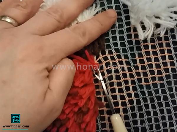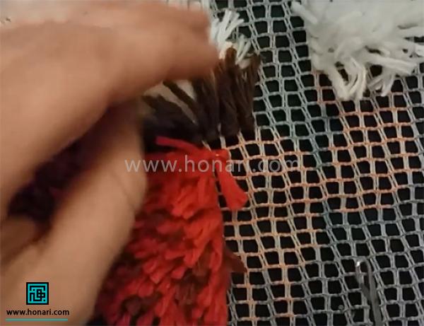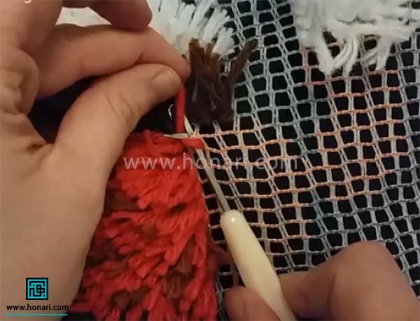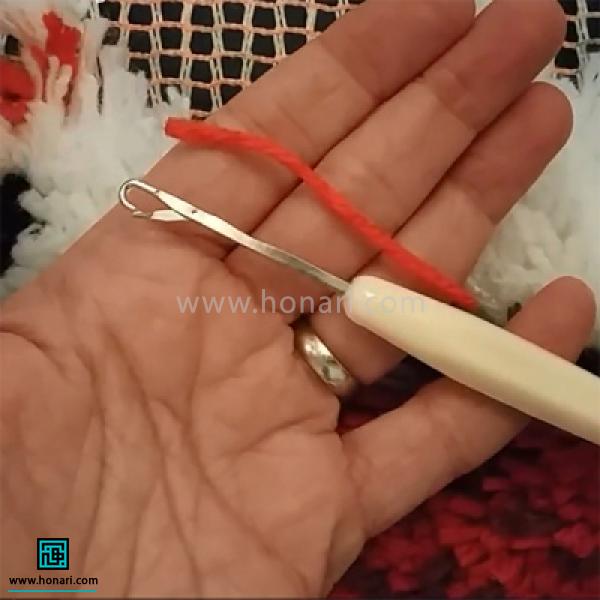 دو لای کاموا را باز کنید و آن را از سوراخ قلاب مخصوص بافت فرشینه رد کنید.