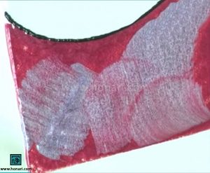 بعد از اینکه کار کمی خشک شد، رنگ نقرهای را روی آن پخش میکنیم و مقداری هم با رنگ زرشکی قاطی میکنیم.