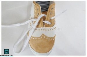 ابتدا با یک ماژیک، نقشه‌ای که در ذهن دارید را روی کفش پیاده کنید. پیشنهاد می‌شود که این کار را از قسمت زیرین کفش آغاز نمایید.