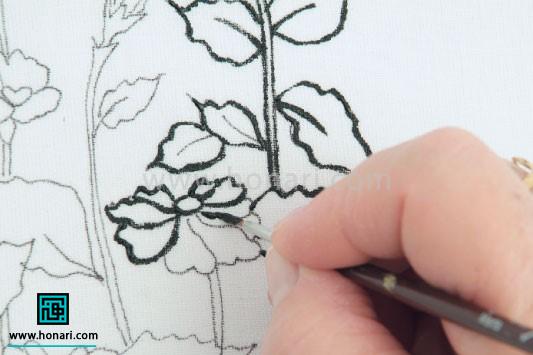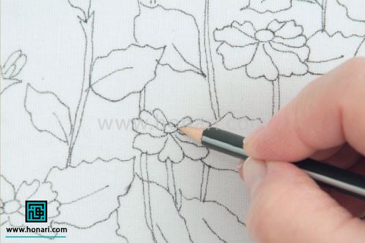 حالا با یک مداد، دوباره روی خطوط طرح می‌کشیم تا طرح به آرامی روی پارچه منتقل شود.