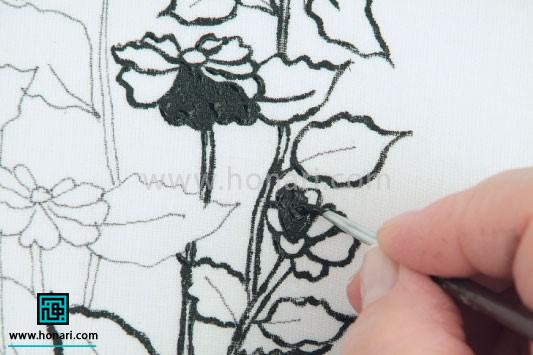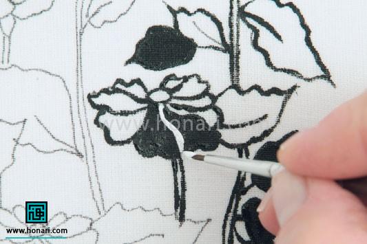 با استفاده از یک قلم موی نازک، خطوط طرح را با دوری رنگ می‌کنیم تا برای کشیدن روی پارچه آماده شود.