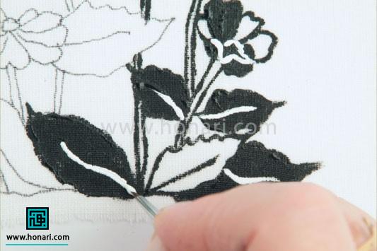 با قلموی شماره دو، گلبرگ‌ها را به رنگ‌های مشکی و سفید رنگ‌آمیزی می‌کنیم.