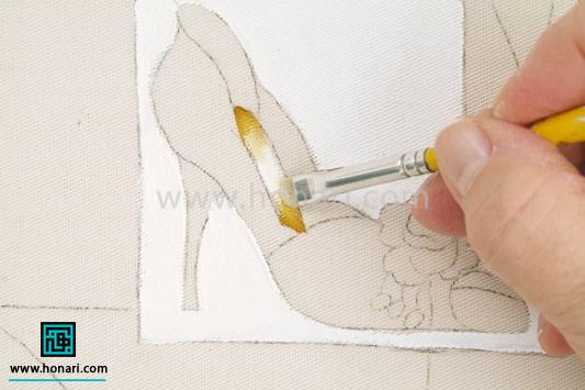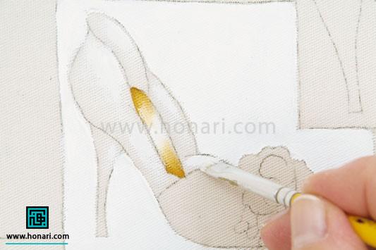 با یک قلم موی شماره ۶ و کمی رنگ سفید، کفش را با حرکت دادن قلم مو به صورت بالا و پایین رنگ می‌زنیم.