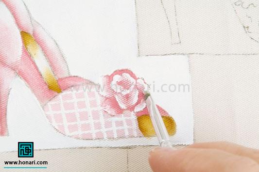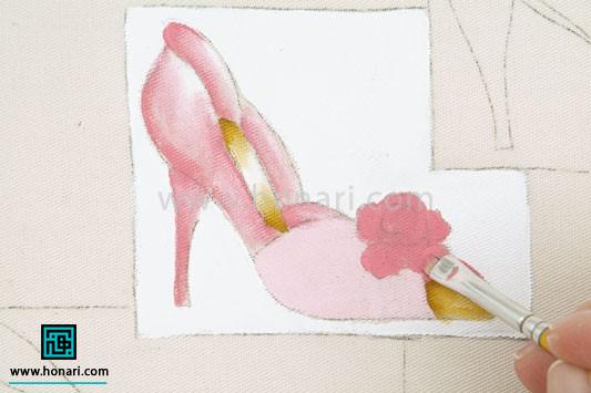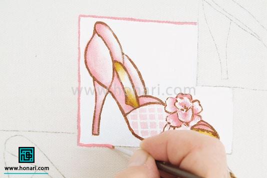 با یک قلم موی شماره ۶، رنگ صورتی تیره را که با رقیق‌کننده مخلوط شده برمی‌داریم. سپس بخش‌های داخلی و بیرونی کفش را به آرامی سایه‌می‌زنیم تا حالتی برجسته و بافت‌دار به خود بگیرد. بعد از آن، نوار داخلی روی کفش و طرح گل آن را نیز با همین رنگ صورتی تیره کاملاً پوشش می‌دهیم.